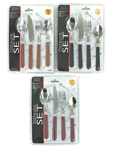 A soup spoon, a butter knife, a fork and a small spoon are included in this 4 piece set. Fashioned from durable plastic and high-quality metal, this set is dishwasher safe and provides either a nice complement to a household set of flatware, or a set for everyday use.